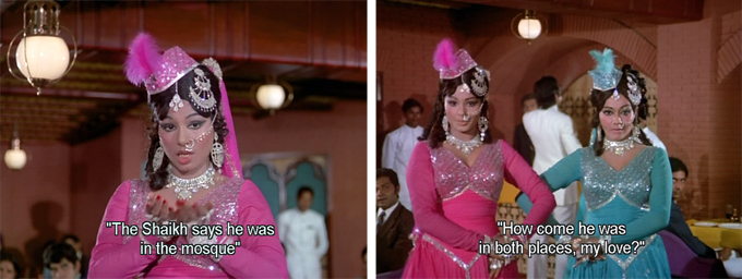 This leads to a flashback of the party and an excuse for a lovely song and dance featuring Padma Khanna and Jayshree (plus it’s an Asha-Usha sister duet, which I always love) “Jo Yahaan Tha Woh Vahaan Kyon Kar Hua”. I am so grateful that the songs are (mostly) subtitled in this, because Sahir Ludhianvi is the lyricist for Ravi’s melodic songs and I adore the witty lyrics for this one, about how a man can be in two places at once!