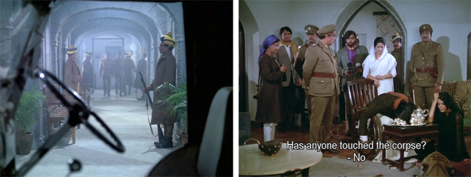 Shekhar comes up with an elaborate scheme which will obfuscate the time of the murder (changing it to 11 pm instead of 10:30 or so) and manufacture an alibi for Rani (besides her, the household contains her mother-in-law, younger brother-in-law, and two servants). He demonstrates how it will work to Rani, then removes his fingerprints from every surface and thing he has touched and leaves. All goes as planned, with the result that the maid (Ashoo? Anybody know?) finds Ranjit’s body after she and Rani hear a gunshot while they are in the kitchen brewing tea.
