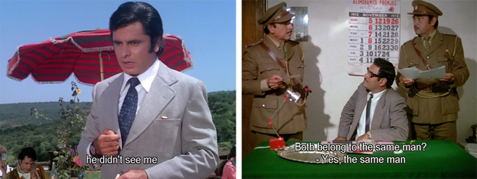 Suresh goes to the hotel where Shekhar is staying and is relieved when Shekhar fails to recognize him. The police discover that his fingerprints are on the silver tray (the only thing not wiped clean by Shekhar, because Ranjit’s face was on it) by matching them to ones lifted from the cigar he gives Joshi (which also match the brand they had found near Ranjit’s body). They are so forensically…competent!