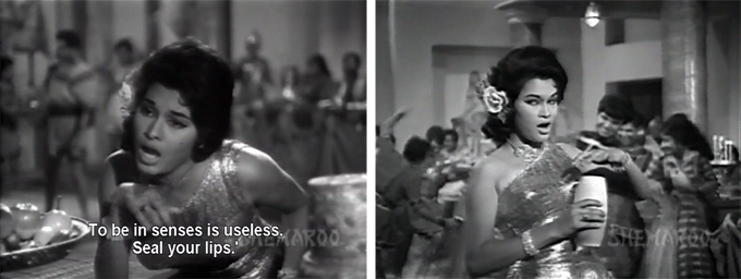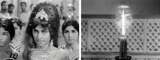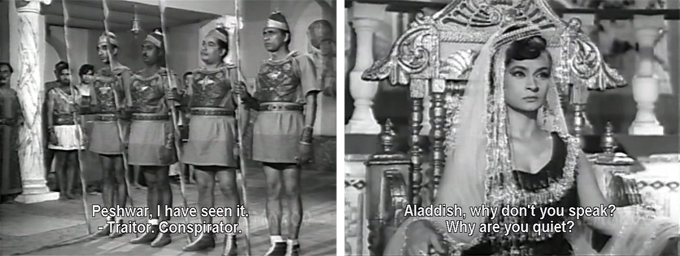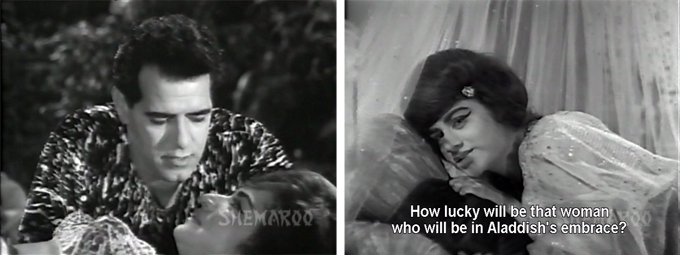 Saloni is—and who isn’t—instantly smitten with Aladdish herself. Back in Yunan, Asmilla’s maidservant (who is also an unfortunate participant in the most tedious CSP ever, with Brahmchari as a stuttering guard who does nothing but say “mumkin” and “namumkin” to emphasize his speech defect. It goes on and on and thank goodness for the FF button!) helps her mistress escape during a religious festival. Aladdish remains loyal to his beloved, which really pisses off Saloni—this is bad news, because the bouffant beauty turns out to be a magician of sorts.
