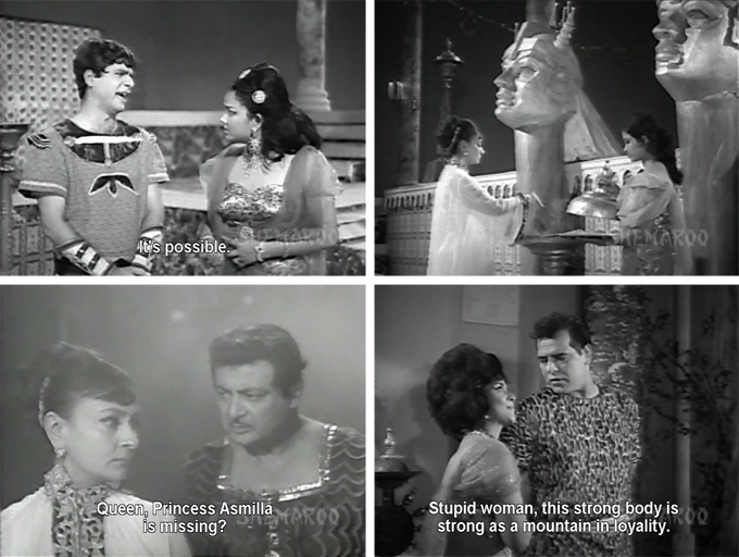 She gives him a potion which saps his strength from him and ties him up in her front yard, while Olympia’s Chief Minister brings her the news that a volcano has killed the Princess Asmilla. If that all seems random to you, it does to me too. We have gone from a tale of conquering armies and court intrigue to immortal enchantresses and volcanos in no time flat. It’s The Iliad and the Odyssey in Indian B-movie form!