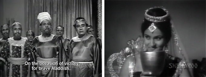 Khair. Dara Singh plays Aladdish (sometimes Alatis), the general of the kingdom of Yunan’s (sometimes Huzeban) army. Aladdish cuts a swath through neighboring kingdoms, conquering territory for Yunan. In Karthik he wins the heart of Princess Soferika (Aruna Irani), the daughter of vanquished King Alibadh (Prithviraj Kapoor looking very like his son Shammi) when he refuses to imprison her and her maids.