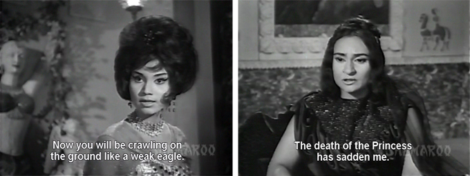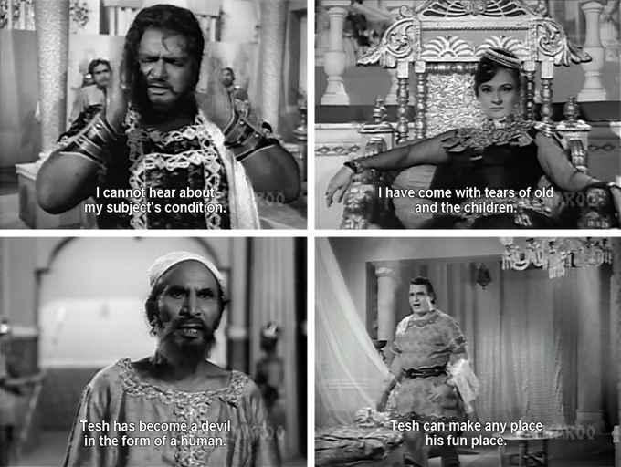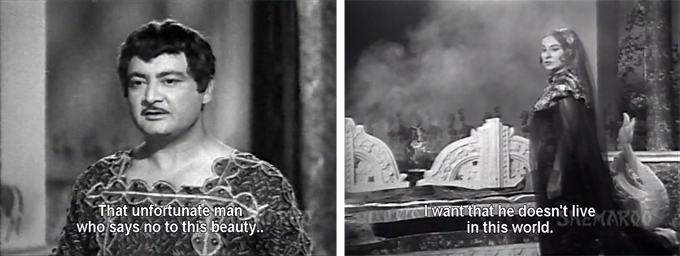 I can’t say I was very impressed with the only Dara Singh film I’ve seen so far – Rustom-e-Hind – but this one sounds far worse. On the other hand, Nishi Kohli is an old favourite of mine, and I think Nadira looks so stunning in that “Why are you silent” screen cap. I’d see this just for them.