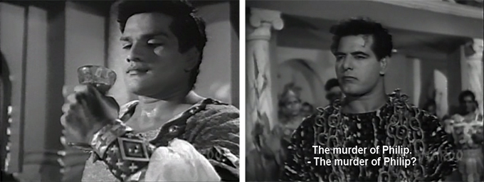 At the rate these females keep falling for Sher-e-Watan, it would appear he was the last man standing on this earth. Nadira looks stunning – if they’d filmed that wonderful Indrajal comic about Queen Heloise who lost her gifts of eternal youth and immortality because she fell in love with The Phantom at age 400, I would’ve prayed for her to get the role. All the other lassies are so lovely too. As for Prithviraj Kapoor, I remember looking at a poster for `Sikandar’ or was it `Sikandar aur Porus’ and thinking he reminded me of Shashi Kapoor (we never did get tickets to watch the movie, our school had recommended we go see it). He’d specialized in playing imperious, cranky, sometimes ineffectual monarchs, I’m observing.“The sage elders of Yunan are spared the indignity of mini-skirts, instead dressed in satin nightgowns which emphasize their man-boobs in a somewhat unfortunate manner.” Still laughing over that.