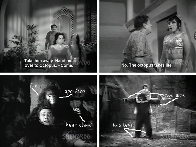 If I didn’t know any better, I would now believe that Sher-E-Watan means “Men Without Pants”. Experienced Dara fan though I am, the sheer amount of male crotch-and-thigh on display amazed me; most of them wear nothing longer than a micro-mini tunic (Dara’s looks like leopard print velvet) or short skirt. Female costuming is confused and random, ranging in style from Arabian Nights to 1950s American Prom. Of course, I am not complaining; in fact along with the music by Usha Khanna, muscular men and pretty women in sparkly costumes are basically the reason to see this. Along with the monster named Octopus which is actually a man in an ape suit with bear claws.