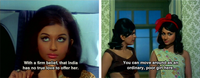 I personally think this was a well made movie, considering it was the 60’s. It hits the fact that you can take a person out of India but not the Indian in them , mainly the culture,the values that one is brought up in , it is always present no matter where. It touches a gamut of emotions. I like the way movie starts with Deepa being heartbroken three times by her own kind, and she out to seek love which could happen to any rich girl or anyone for that matter . I love the color coordinating clothes of Shammi and Sharmila mostly throughout the movie. I love the fact Shammi did not expose himself in the song , wonder what the so called aping heroes of today would do? -no guesses there .