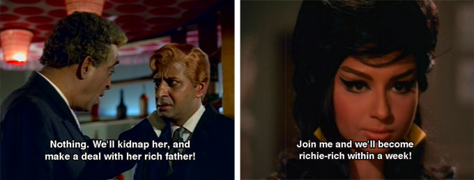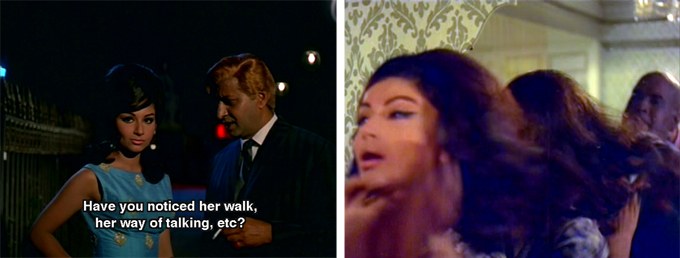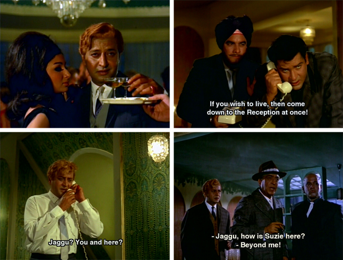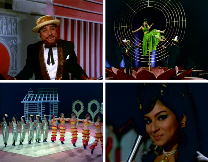 Suzie is a cabaret dancer who performs in Jack’s casino and is also, it is implied, his lover. This is of course the perfect setup for a fabulous cabaret song-and-dance (“Leja Leja Leja Mera Dil”), and it gets the full 1960s treatment: gori dancers alongside Indian ones, numerous changes of clothes, crazy rotating sets and an enthusiastic cameo by Madan Puri as the master of ceremonies.