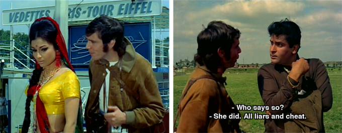 He sabotages Jacques at his next meeting with Deepa and introduces himself to her instead, pretending to be a Frenchman who lived in India for a spell (to explain his fluent Hindi). His somewhat obnoxious behavior does not endear him to Deepa, but in true Shammi fashion he doesn’t give up and even pursues her to Switzerland where he finally wins her over.