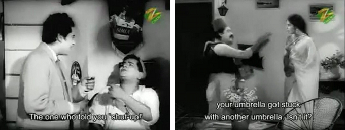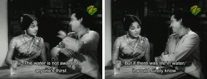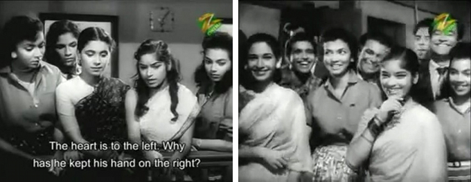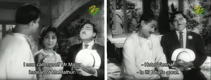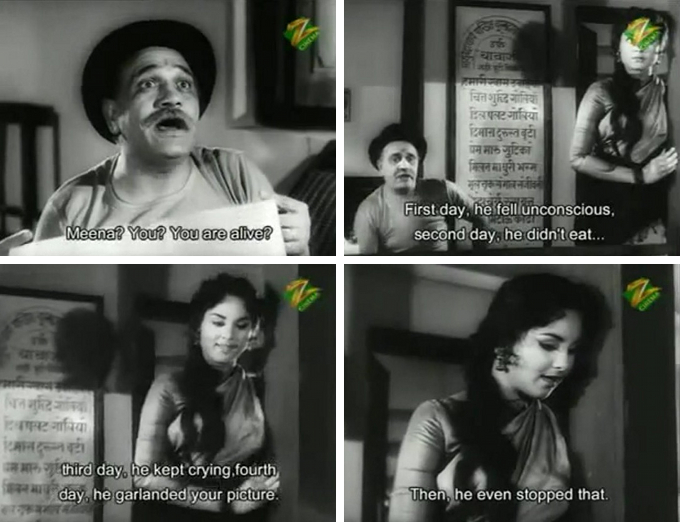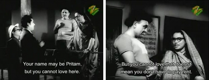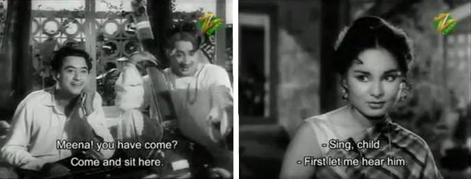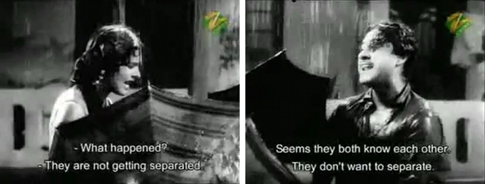 In any case, Pritam soon meets a pretty girl by the name of Neena (Kalpana) (everybody says “Neena” although it’s subtitled “Meena” throughout) on a rainy day when their umbrellas blow away and collide.