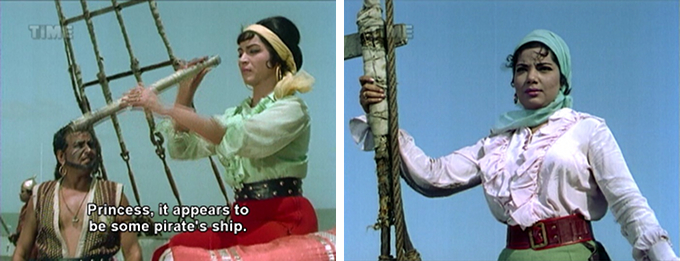 Finally Darang remembers that he is supposed to be avenging his parents’ murder at the hands of the Sultan, and he orders the ship to return to Amania just in time to be framed by the Vizier after he murders the Sultan himself. The Vizier tells Shabana that Darang is the culprit and of course she believes him, although he’s made no secret of his ambitions. She angrily rejects Darang when he shows up at the palace. He manages to escape, and when the Vizier tries to force Shabana to marry him she too runs away on one of Amania’s ships—and soon runs into trouble, when a kickass female sea dacoit named Babina (Kammo) captures her.