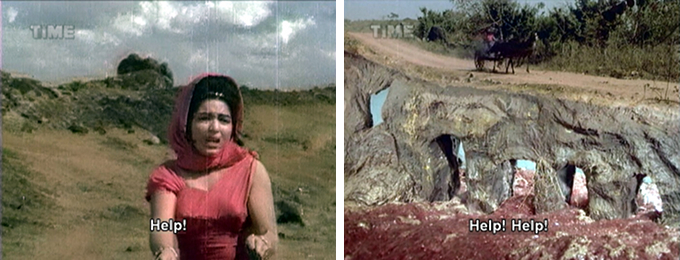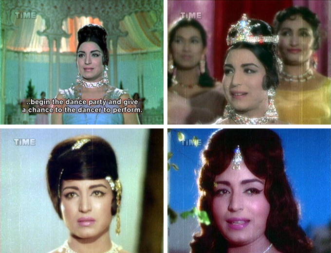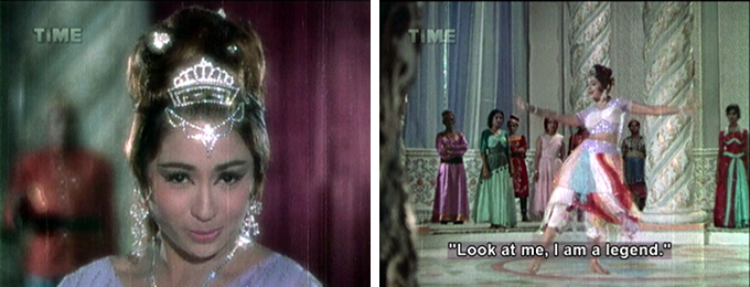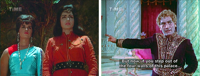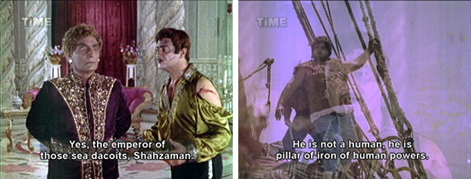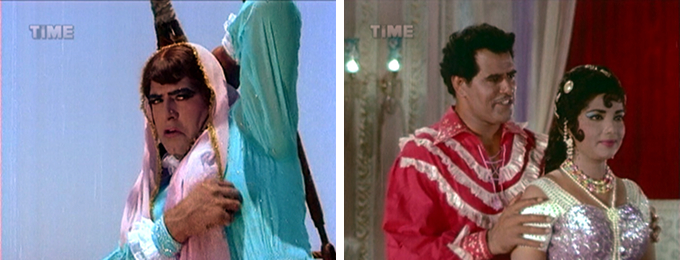 There were enough things to get me through it: Dara’s ruffled sea dacoit shirts, Prithviraj Kapoor, dancer Kammo as a female sea dacoit, lots of sparkle and terrible wigs, and lovely songs including a Bela Bose dance aboard a sea dacoit ship. Plus the subtitles, inept as they are, are often hilarious. And when I tell you that Memsaab favorites Hiralal, Jeevan and Rajan Haksar vigorously ply their histrionic powers you will understand that subtlety is no hallmark of the acting either (yes, I know I am putting that in the “plus” column, it needs the support).