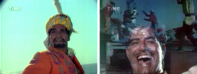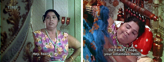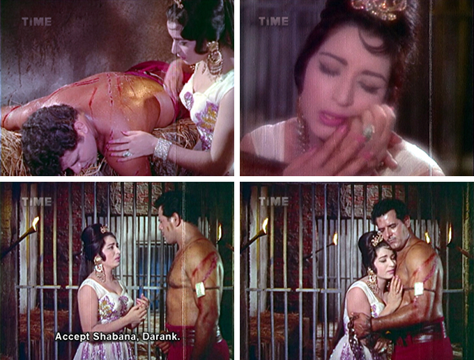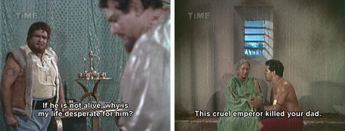Not only that, but Nadula has made another discovery (or as he puts it, “one more terrorizing news”) which causes the Sultan’s eyes to practically bug out. Shahzaman has a tattoo of the sun on one of his brawny arms, the symbol of the royal family of Amania. The Sultan quickly orders his Vizier (Jeevan) to bring up the old Queen from her cell. When she refuses to answer his questions about her sons, he orders one of Shabana’s newly purchased slaves Darang (Dara, and subbed Darank but I think it’s Darang)—who hilariously defies her commands, which are all about watching him fight—to whip her. I have never loved Leela Mishra so much as I do here; her face is priceless as she listens aghast to the Sultan’s instructions.