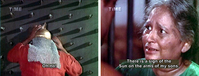 Having wasted valuable minutes and film on it, the writers now remember that they have other plot points to cover so they’d best hurry it all along. In the dungeon, Darang hears the guard refusing to give the old Queen some water. He bends the bars on his cell and does away with the guard (I guffaw at the subtitle as he is flung face-first into a wall of metal spikes).