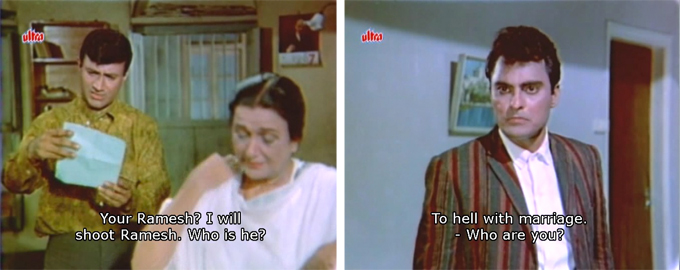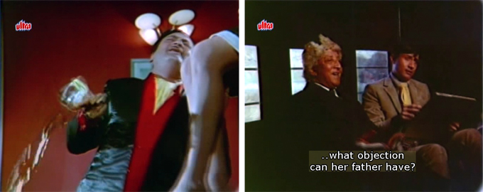 He returns home to find poor Ma weeping and upset over a love letter to Chanda that she has intercepted. I do have to give this film props for trying to send a good message: she blames Chanda, and Rajesh points out that men are equally if not more responsible for leading them astray with sweet false promises. I say “trying” because it’s still all about a brother saving his sister’s honor even if he has to kill someone to do it, just as Roopa’s objections to an arranged marriage are overruled after being paid only lip-service. But I’ll take it!