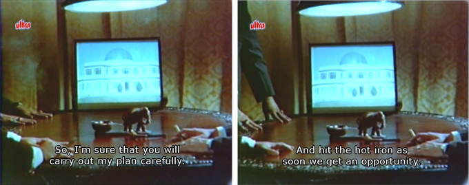 We begin with three unseen men gathered around a table and a cool elephant ashtray, plotting to take over a wealthy man named Dinanath’s palace and wealth. And this version of “strike while the iron’s hot” just makes me laugh out loud.