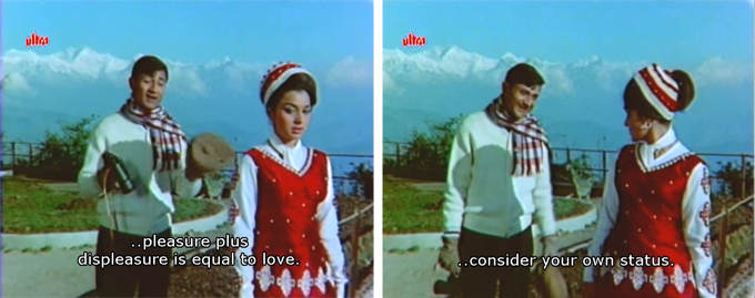 Anyway, Roopa of course still believes that Rajesh is a mere chauffeur (which is true) and is unaware of the whole Ravi plot he’s entangled in. After some comedy (Kamal Mehra), another song, and lots of wooing, Roopa falls for handsome Rajesh. Her parents, thinking now that he IS the real Ravi, are overjoyed and push for their engagement, especially after the two of them get caught overnight in a rainstorm—giving us this absolutely lovely and heart-tuggingly romantic song (and no Hypothermia Rape!). Asha and Dev are just marvellous together.