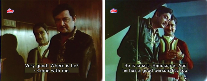 They quickly recognize each other as childhood friends and Ramesh, who really loves her, is soon engaged to Chanda. This is the opportunity Moti has been looking for. To raise the money for the wedding, Rajesh takes to the gambling tables for the first time on his own behalf and is quickly cheated by Jimmy. Moti intervenes and offers Rajesh 40,000 rupees if he will pose as Dinanath’s nephew Ravi, set to inherit all the wealth when Dinanath—now on his last legs—expires. Moti explains that he himself is Ravi but that after a long estrangement he doesn’t want Dinanath to see what a bad guy he’s turned out to be since he last saw him at age ten. It’s a long and complicated story which would have raised about a million red flags for me; for example, Dev Anand may be able to pull off being 28-year-old Ravi, but there is no way Rajan Haksar can!