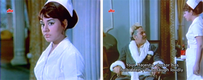 Rajesh of course can’t see it through and he knocks the glass out of Dinanath’s hand, to the nurse’s great frustration.