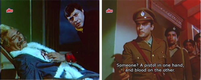Unaware of this development, Rajesh goes to see Dinanath. As he enters the house, Dinanath’s voice instructs him to retrieve a revolver out of his desk and bring it to him, saying that he is afraid. Rajesh does so—but Dinanath is dead, also murdered, and he isn’t the man Rajesh thought he was, but someone else (Uma Dutt) altogether! Of course he is now thoroughly framed (blood on one’s hands=incontrovertible guilt according to filmi police philosophy) for the real Dinanath’s death as Ramesh and Shyam burst into the palace with a bunch of policemen.