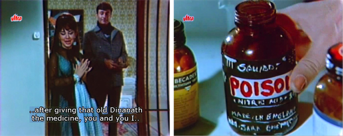 They agree that they will kill Dinanath the next day, and I crack up at the sight of a bold “POISON” bottle on the medicine cart. If Dinanath, who is seated right next to it, even glanced at the cart he wouldn’t be able to miss that label! Oh Hindi cinema, how I love your total and complete lack of the subtler nuances.