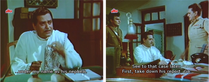Rajesh feels guilty about the lie, and determines to tell everybody the truth, starting with Moti—until he finds out about Moti’s murder. Someone telephones Shyam, Rajesh’s employer in Calcutta, to tell him that Rajesh is masquerading as Dinanath’s nephew; it turns out that Shyam himself is Ravi, the real nephew of Dinanath. He comes to Darjeeling to find out what’s going on and goes to the police—who include Ramesh, Rajesh’s brother-in-law and old friend.