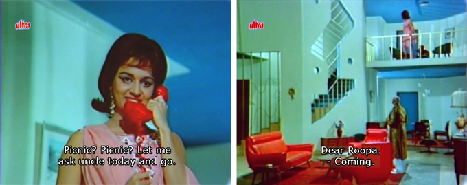 Across town, a pretty girl named Roopa (Asha Parekh) has just graduated from college with honors and she’s planning to celebrate (with a picnic, of course!). She lives with her uncle in a much more affluent style than Rajesh. I love the way Hindi movie houses always remind me of cruise ships.