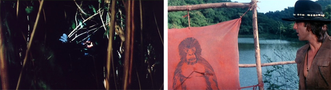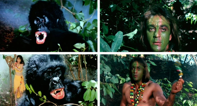 The gorilla suit is quite spectacular, I must say, and so is Kishan’s camouflage even if it does stop at the neck down. He rescues Anjali—using his large colorful beads—after she sends the boy and his mother back towards the village using herself as bait to distract the The Pagal One from them.