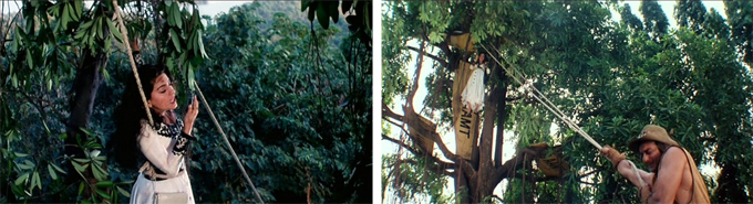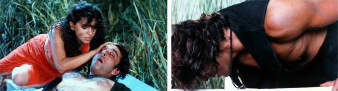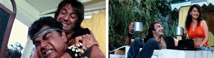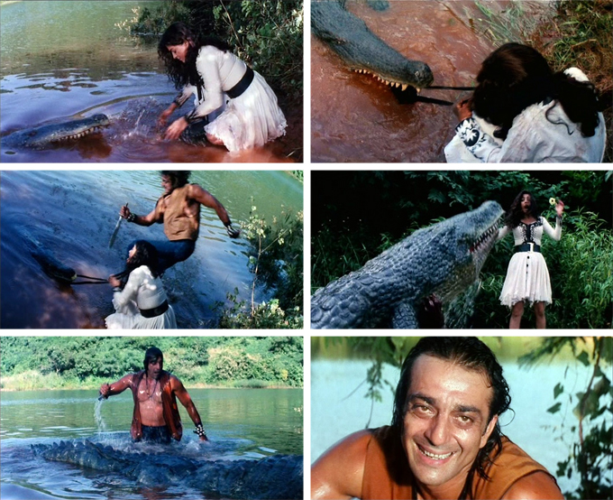 She has missed the murder but as she flies away Gwana and his men open fire on the plane, hitting the fuel tank. She crashes into the jungle and is saved from death by some tangled vines which leave her hanging upside down. She is rescued by Captain Kishan himself (Sanjay Dutt). He cuts her loose and then fashions a rope pulley thing to get her back up to the plane where the Johnsons and D’Silva have been frantically calling over the radio. She tells them she’s fine and retrieves her camera. The sight of her hanging from the tree like a marionette also makes me giggle.