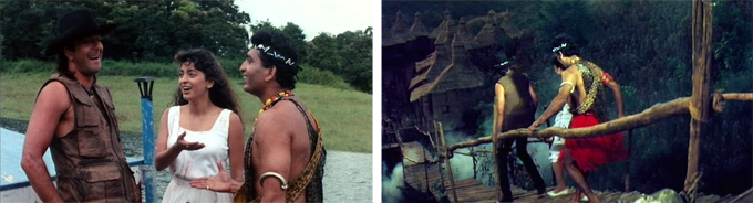 They set off for Kabila in Kishan’s boat (the Captain), haughty city girl and affable jungle man (I love the Caribbean-flavored title song which Kishan sings as they go). Meanwhile, Anjali’s father arrives on Manjira where D’Silva reassures him that since Anjali is with Kishan she will be safe. But Gwana and his men have now reached the plane wreckage, discovered that the camera and Anjali are gone, and are continuing in pursuit.