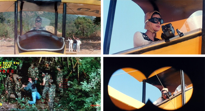 She mounts a camera to the side of the plane and takes off over the island, looking for Kabila (the location they’ve chosen for the factory) and talking with the Johnsons and Uncle D’Silva as she goes. While thus distracted she fails to see a camp full of armed men below her; their leader Gwana (Sharat Saxena) murders one of them in full view as the camera rolls. Seeing the plane (she is flying very low, dangerously so it seems to me), Gwana grabs some binoculars and spots the camera just as Anjali’s attention returns to it.