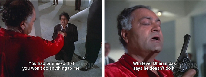 Millionaire businessman Dharamdas (Pinchoo Kapoor) has a small only son whom he dotes on. Dharamdas’ respectability is only a veneer, however; he is really an underworld don with one of my favorite Villain Mantras of all time.