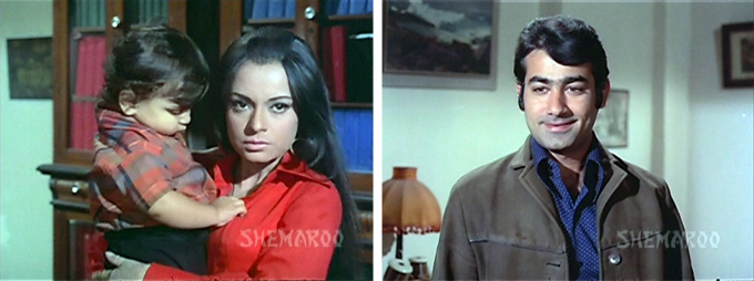 This film doesn’t seem to have made much of a splash and I have no idea why. The story is good fun (if peppered with holes and dragging a bit in places, mostly towards the end) and the performances and humor spot on. Only Nikhilesh was sort of bland and provided the only moment that grated on my nerves (he lectures Rita on her lack of womanly feeling and she “sees the light”); even Keshto’s drunken schtick was mostly funny. I laughed a whole lot through this one, and I can’t say that about many Hindi movies. The humor never descends into that frantic mugging which characterizes so much comedy, but remains understated and the dialogue—even with hamfisted translation—is very witty. I even rewound several scenes to watch again. The songs are good, the lullaby especially, and Helen and Rehana charm with a couple of cabaret numbers. If you want some hearty laughs and for your heartstrings to be gently tugged, this is one you should see.