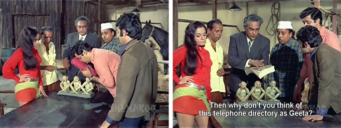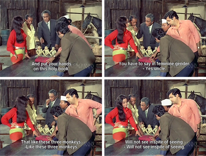 Their initial meeting with Mamaji supplies very few details of the plan except that Navin and Rita are to pose as husband and wife until it’s all over. Then he makes the gang take an oath which makes me giggle:
