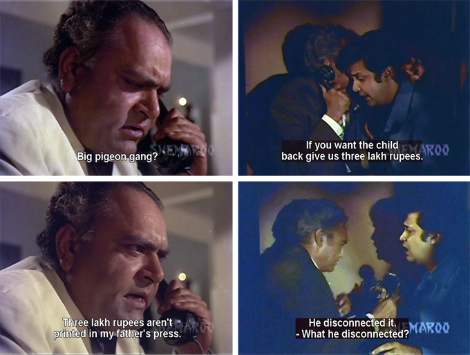 Can Mamaji and his “Big Pigeon Gang” get little Golu back safe and sound? What will Rita (or Tiger) do if they don’t? Will clever, ruthless Dharamdas eventually pay their ransom demands, or will his considerable resources enable him to track his son down on his own? Will this bunch of misfits actually pull something off for once, or is Bhola going to end up back in jail all by himself? And why is Mamaji’s red convertible called Bada Kabutar, anyway?
