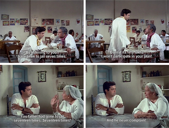 How completely marvellous to have a son trying to take the straight path (he says he will sell bananas or baniyans) only to have his mother react with complete scorn! She points out with some logic that if there were no criminals the police and jailors would lose their livelihoods and professes humiliation at the thought of her beta making an honest but poor living.