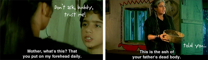 Parvati is less pleased with Suraj’s devotion to his father’s profession; she only cares about vengeance. But when Suraj asks her why she applies ash to his forehead every day she always says that the time has not yet come to tell him everything. *Minor spoiler in the screenshot below*