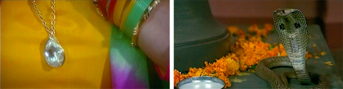 Meanwhile, Charles the snake has been biding his time in that same temple where Parvati gave birth twenty-some years before. When Reshma goes to the temple on Nag Panchami to worship, she is wearing her father’s diamond necklace and Charles is roused from his apathy at the sight of it.