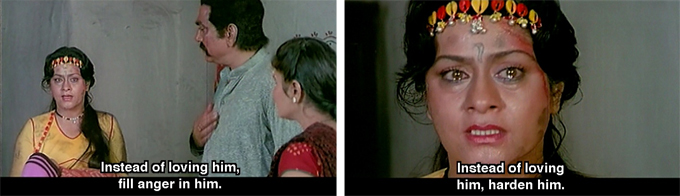 As Parvati cremates her poor husband, the baby cries and she whips out her breast (seriously!) to nurse him. She notices that Charles is sitting there too and realizes that he hasn’t been fed in two days. Close-up of same breast squirting out milk onto a pottery shard (seriously!). She feeds the snake, and then implores him to leave them as she can’t take care of both “sons” on her own. Then she somewhat unwisely, in my view—given she has a baby to pump full of hatred—goes to Raghuvir’s house with a machete in hand to take her revenge, and overhears him gloating about the theft with his friends. Raghuvir’s father (Kamal Kapoor) arrives and she informs him that his son is responsible not only for her husband’s death but also the theft of the diamonds and the murder of the priest.