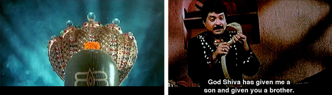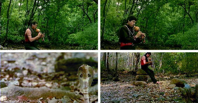 (Yes that is Sudhir in the screencap to the left, and yes, Bhairav kills both of them. He is so evil.) Meanwhile at that same temple a snake charmer named Gangu (Kuldip Pawar) and his wife Parvati (Aruna Irani)—who is in labor—have taken shelter to escape a storm while Parvati gives birth. They are accompanied by Gangu’s prized king cobra who is unfortunately not given a name (at least not in the subtitles), but whom Todd in his extremely funny and much pithier review of this same film has dubbed Charles. If it’s good enough for Todd it’s good enough for me, and this is most definitely a snake who needs a name.
