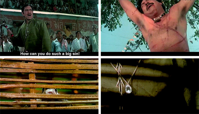 Of course the theft of these diamonds and the murder of the priest cannot go unpunished; when some other worshippers (it’s a very busy place!) arrive they see a horrified Gangu pulling the knife out of the priest’s body, making him obviously guilty *eyeroll*. And so Gangu is made the scapegoat for the theft by the gleeful trio of Raghuvir, Bhairav and Sampat. They whip him to death in the town square as the bloodthirsty population watches and Parvati screams for mercy, baby in her arms. Charles thrashes in his basket trying desperately to escape, and his beady little eyes memorize the details of Raghuvir’s distinctive diamond necklace.