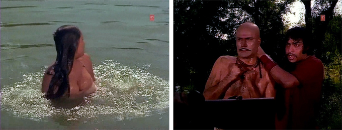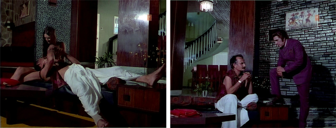 In Raja’s cave, Janiya has now decided that she loves Raja whom she had previously scorned. And unfortunately, Pandit decides that he loves (or wants, more precisely) Janiya whom HE had previously scorned. After he tries to rape her one day, the long-standing friendship between him and Raja is broken and he is banished from the gang. The attempted rape scene is interesting for two reasons: one, the film itself has an “Adults Only” (A) certificate and the only reason for it that I can think of are the prolonged (what I suppose the censors might consider tantalizing) hints that Janiya is not wearing anything (although she clearly IS); the other is that Ranjeet is the one who saves her! How delicious is that?!