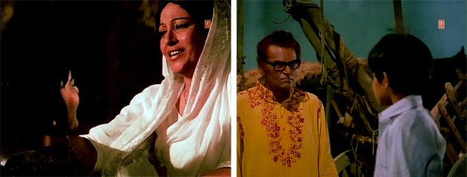 Dance ended and Bhanwar and his bride tied together in what will no doubt be a horrific nightmare for her, Raja either proposes marriage or wants to confer the status of mistress on Janiya. She refuses indignantly: Raja is a criminal, a dacoit! He is amused and returns to his Ma (Veena) and her rather more welcoming arms; we are treated to a flashback which reveals that Raja’s father was making sure his son got a good education before a greedy moneylender (Tiwari) and his assistant (Randhir) ruined him, and he died from a heart attack.