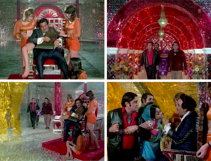 I have no idea what the plot of this movie is—seriously no idea—but I know that I love it. Even if with subtitles it became a maudlin, sexist melodrama (which I doubt) I would still love it. Why? Well for one thing it is extremely shiny. Premnath has a lair made completely out of mirrors, and not in a pretty Mughal-e-Azam kind of way but in a spectacularly gaudy disco kind of way. The songs by OP Nayyar are delightful and the cinematography (VN Reddy) is gorgeous. The cast is a veritable Who’s Who of character actors. And a still-dashing Sunil Dutt makes a dacoit I can really root for, although he does seem a little old for plump young Rekha. The story is liberally sprinkled with dacoit-drama masala ingredients: greedy moneylenders, long-lost daughters, flashbacks, dozens of people named Singh, pretty pretty Marwari horses, and real ruffians lurking beneath a veneer of respectability and draped with scantily-clad gori extras. I felt totally sated by the end.