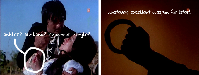 But before Dhanraj can get to the police station Raja discovers that she’s been arrested. Although Pandit is once again reluctant, Raja immediately organizes a rescue. It is accomplished with a maximum of noise, smoke, and gunfire, and Janiya is grateful—and impressed by Raja’s manliness (so am I). Pandit is shot, but escapes and makes his way back to the dacoit cave: he is pretty angry and I assume it’s because he’s been shot over something he didn’t want to do in the first place. I could be way off on that. Raja knocks him out with a swift punch to the face, takes out the bullet and douses the wound in liquor.