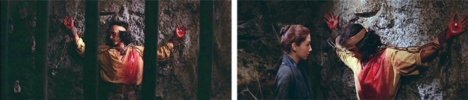 Von Schram’s daughter Maria has also watched Jaka being dragged through the courtyard and thrown into the dungeon. That night she sneaks into the dungeon dressed as a ninja and quickly despatches the buffoonish guards (who are also a hallmark of such films). She approaches Jaka in his cell and asks him “Are you all right?”