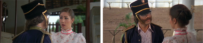 The mutton-chop-sporting commandant of the occupying army, Captain Von Schram (Dickie Zulkarnaen) has a pretty daughter by the name of Maria (Dana Christina). Maria—who has seen Jaka Sembung from her balcony and been smitten—urges her father to be a kinder, gentler, repressing force but he pats her on the head and tells her to go bake a cake (not really, but he might as well). Von Schram is assisted in his evildoings by a “blond” Lieutenant and a pith-helmeted governmental bureaucrat named Van Allen. In the wake of Kabor’s unfortunate demise, Van Allen brings a severely buck-toothed and creepy voodoo priest to the palace to meet Von Schram.