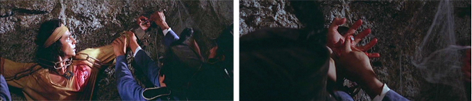 Surti now arrives and does her best in female ninja-ness before being overpowered and thrown into a cell near Jaka’s. He hears her cries and is roused from his misery. Meanwhile, Maria’s mother tries to comfort her by talking about how vile Von Schram is and how their love for him has turned to fear and anger. Then she says, in a nutshell, that they are helpless: “I sleep to forget, you must do the same.” For some reason, this cracks me up.