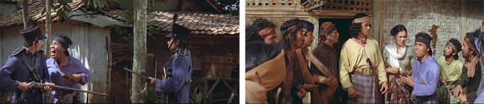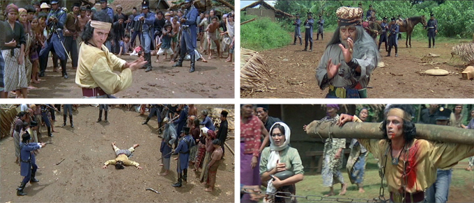 To flush Jaka from his hiding place, which is actually in plain sight given that he lives with his girlfriend Surti (Eva Arnaz) and her buck-toothed father right out in the open, the Blond Lieutenant leads a military raid on a local village. There is much bashing-about, screaming, belligerent yelling and general mayhem. Jaka’s best friend Karya (Dorman Borisman) manages to elude a couple of soldiers by pretending to be mad and kissing one of them, and runs to get Jaka’s help.