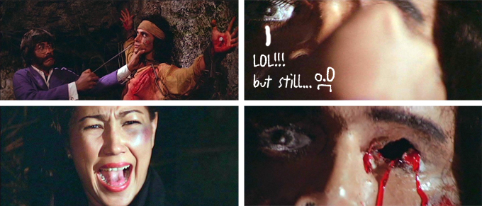 As I said at the beginning, I just could not really love this movie. It is so very grim, and somehow lacking in the gleefully low-budget trashiness of my beloved Hindi B-cinema. It takes itself quite seriously much of the time and compared to the cardboard trapdoors and blinking Christmas tree lights I am used to, the budget and special effects seem pretty generous (although the wigs are no improvement). I think this combination of things is why I can’t ignore the relentless violence and just enjoy the schmaltz.
