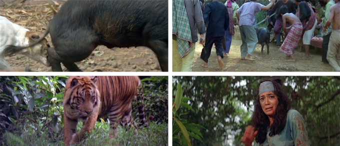 The poor pig is beset first by dogs (a little too realistically) and then, chased out of the compound into the village, by villagers (a little too realistically). Poor Surti is shot in the back by the Captain’s soldiers as she runs after him; bleeding profusely, she follows the pig into the forest where an assortment of pret-ty fierce animals awaits her.